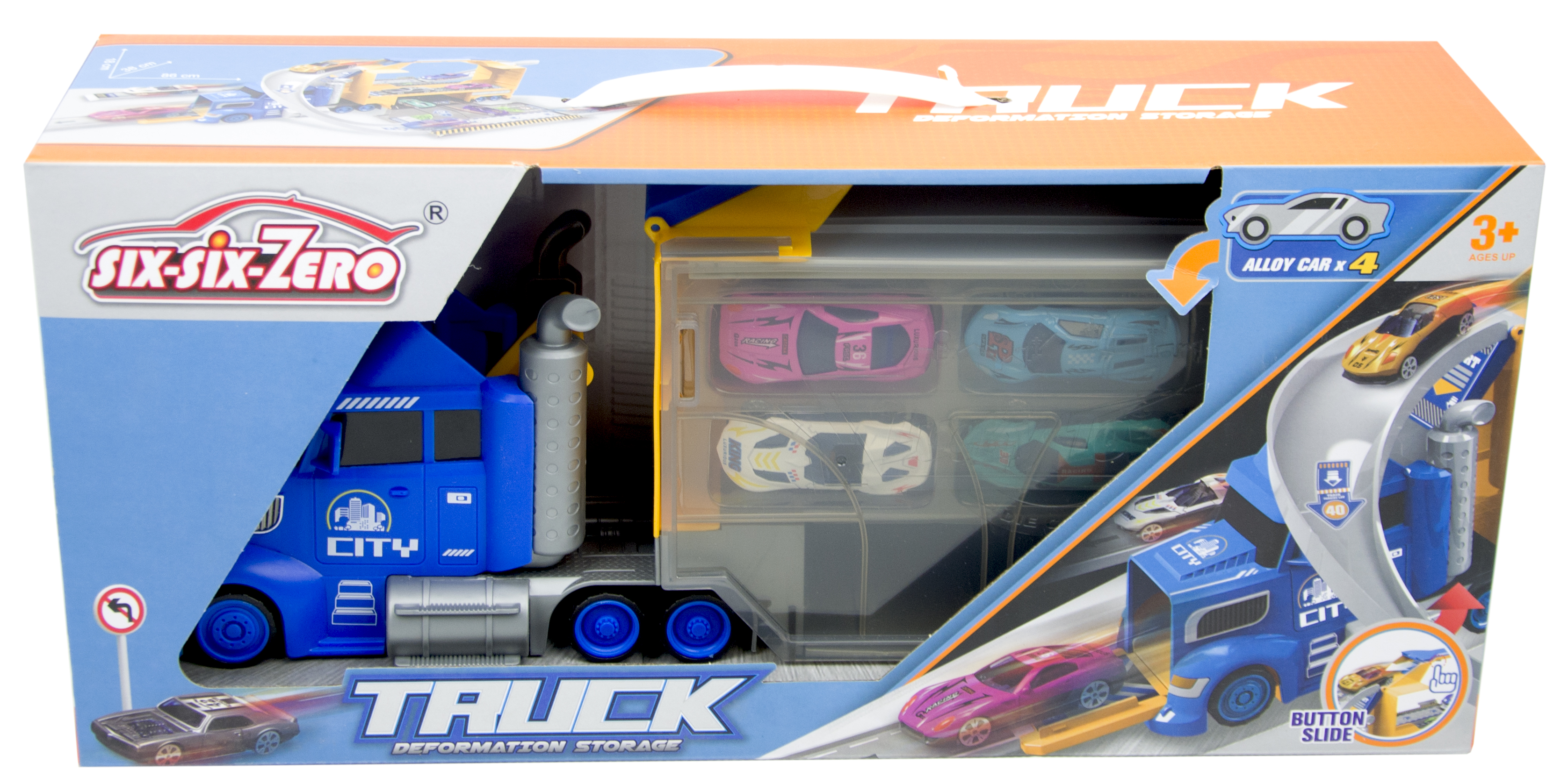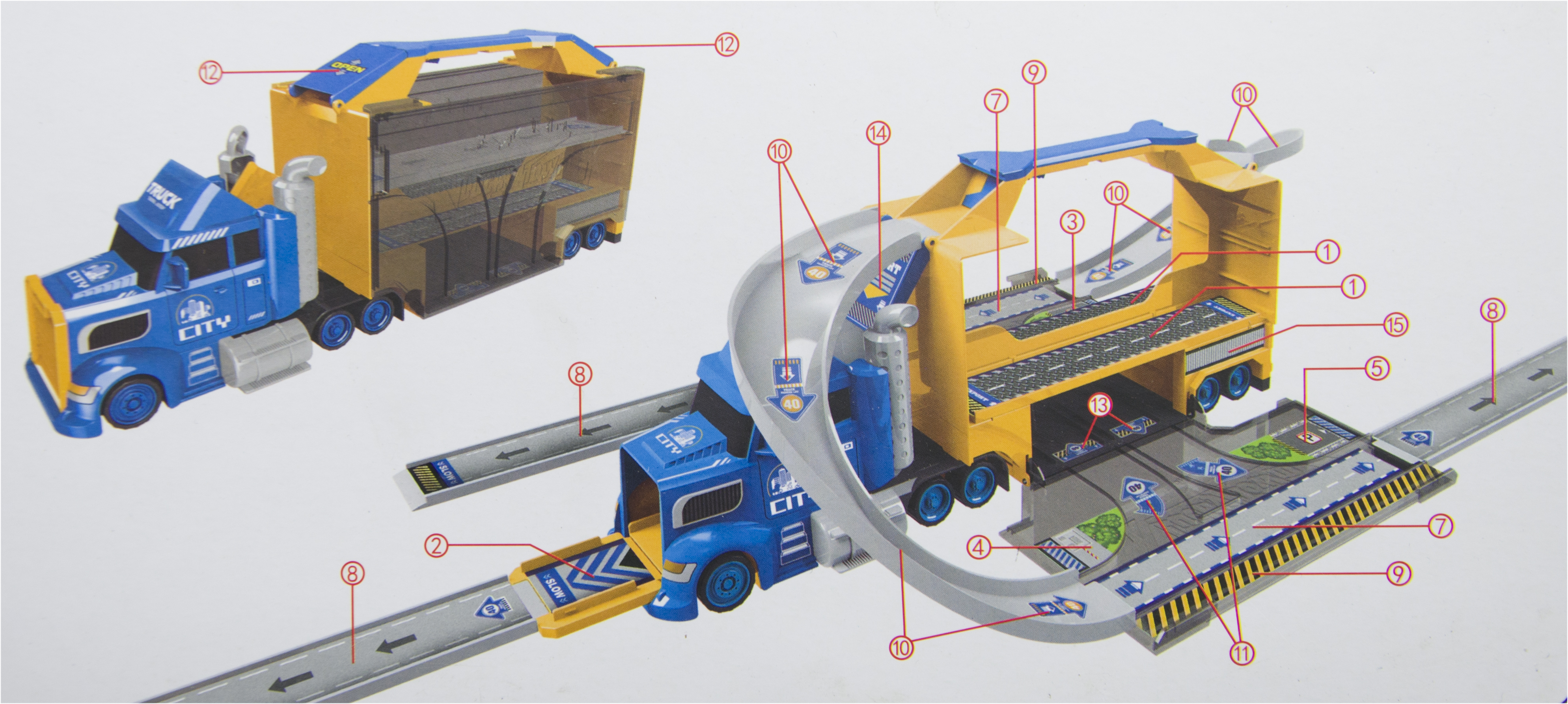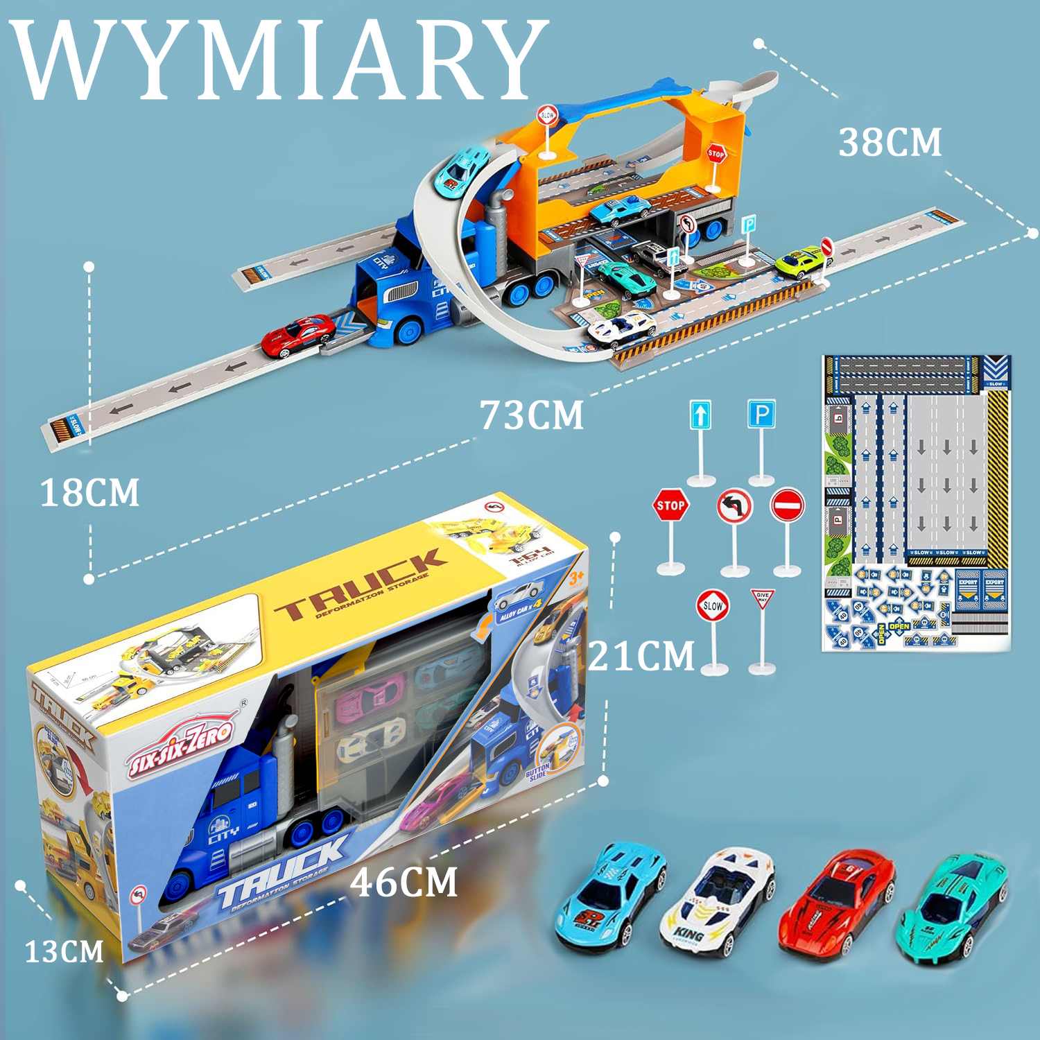 W zestawie znajduje się zielona laweta, która jest jednocześnie parkingiem oraz torem do zjazdów. Dołączono do niej 4 samochodziki w różnych kolorach oraz zestaw znaków drogowych. Jest to doskonały zestaw dla każdego małego fana motoryzacji.