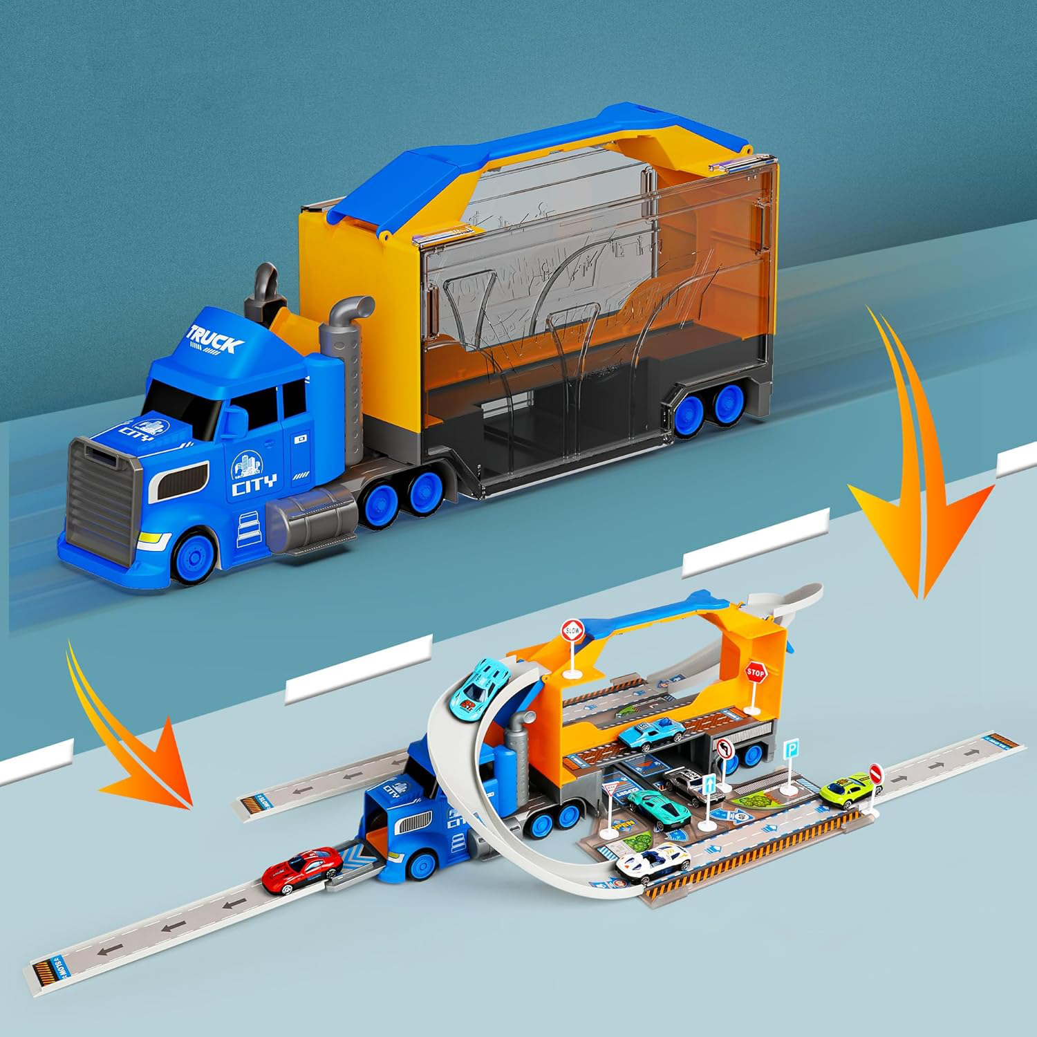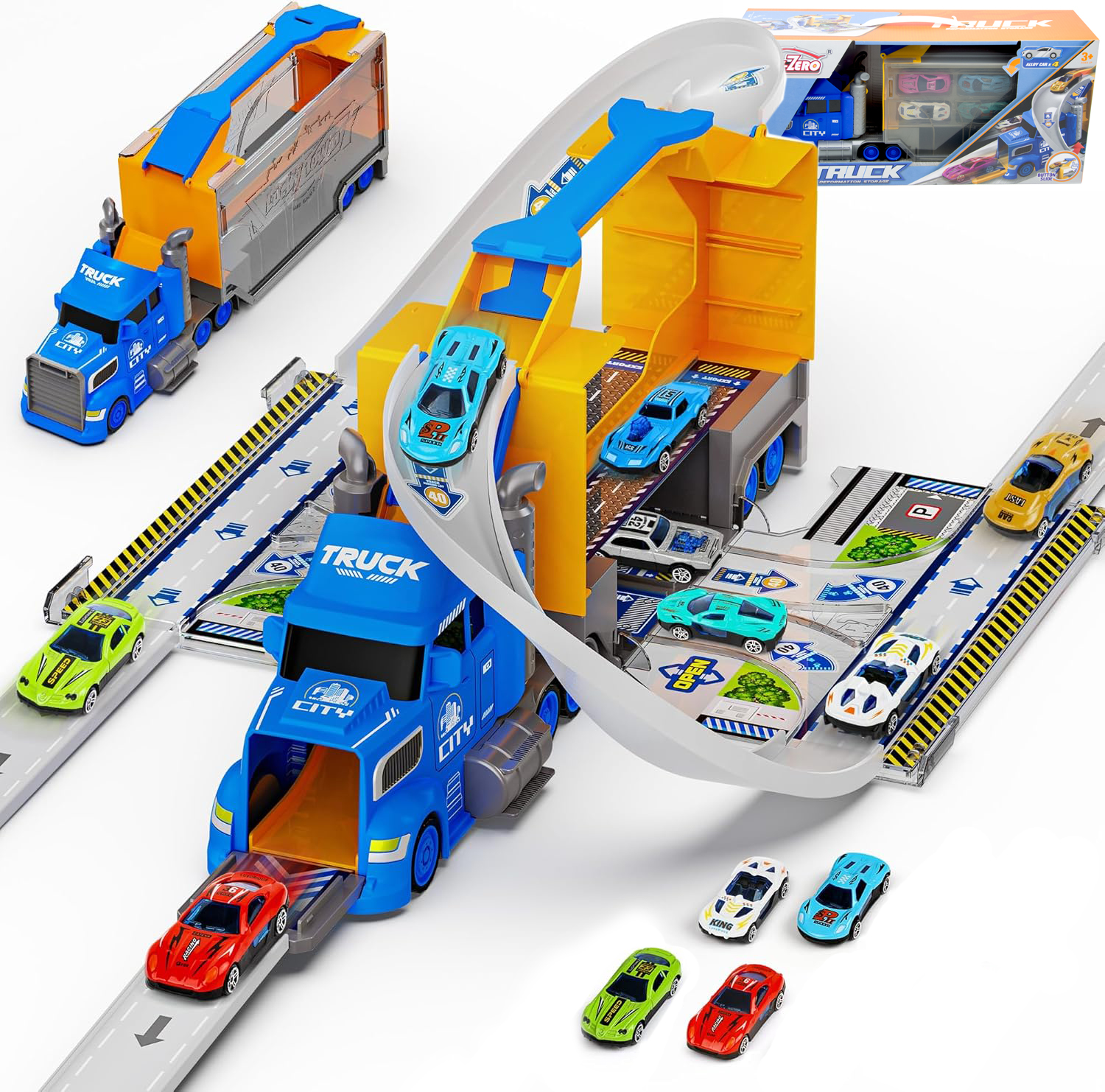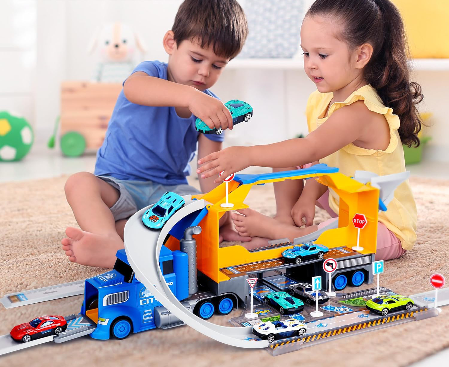 W zestawie znajduje się zielona laweta, która jest jednocześnie parkingiem oraz torem do zjazdów. Dołączono do niej 4 samochodziki w różnych kolorach oraz zestaw znaków drogowych. Jest to doskonały zestaw dla każdego małego fana motoryzacji.