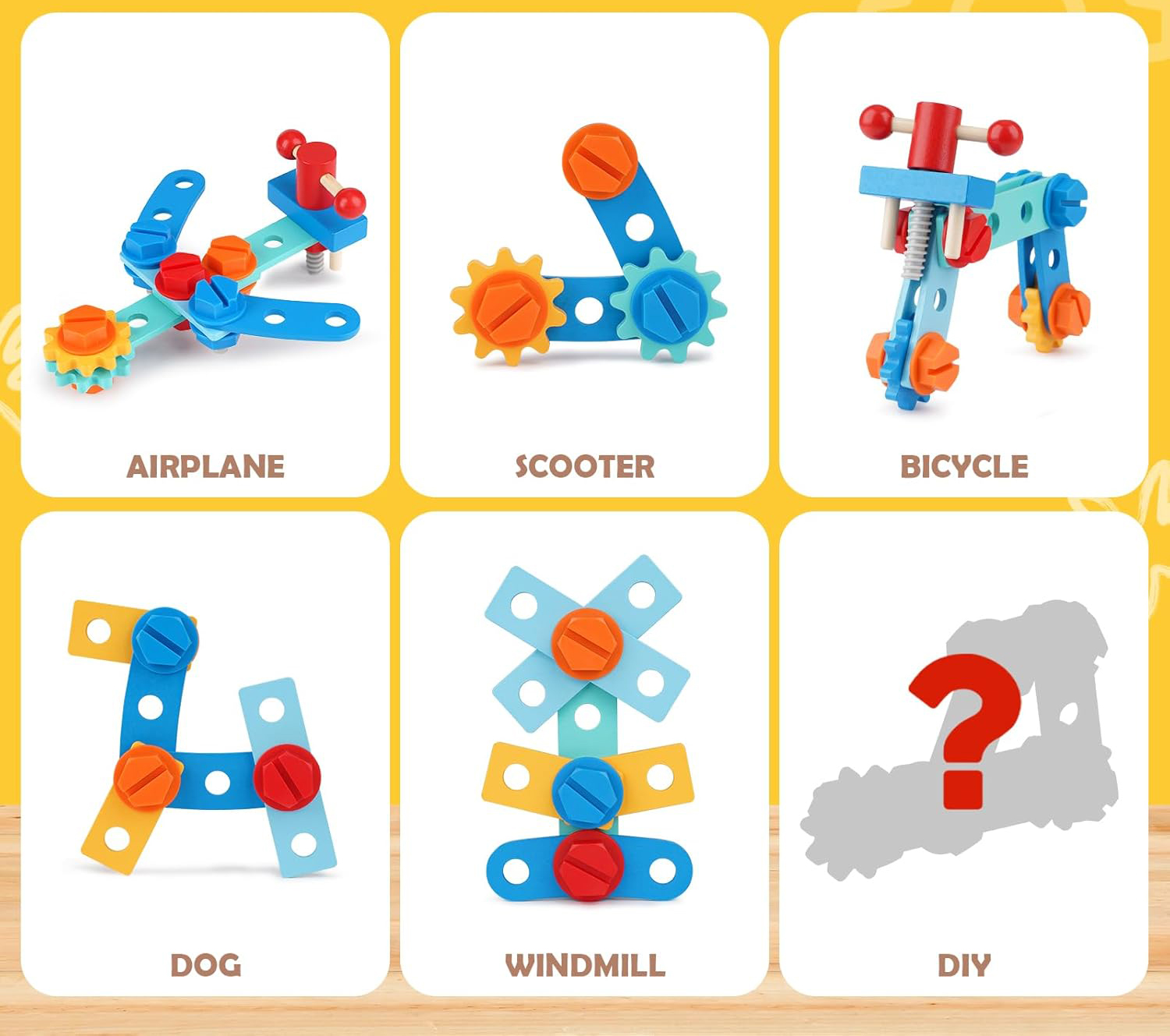 - materiał: drewno, karton, plastik