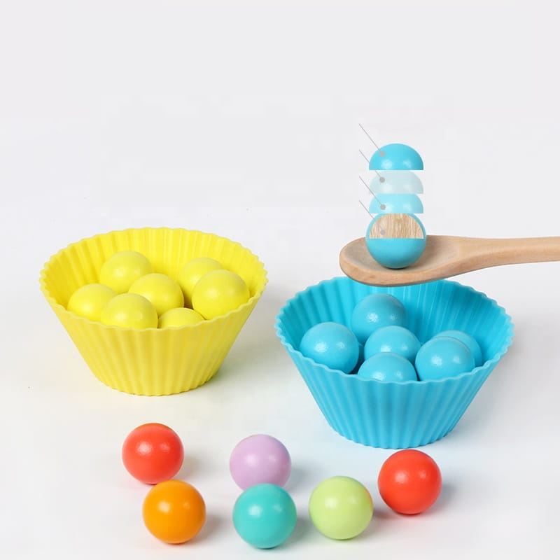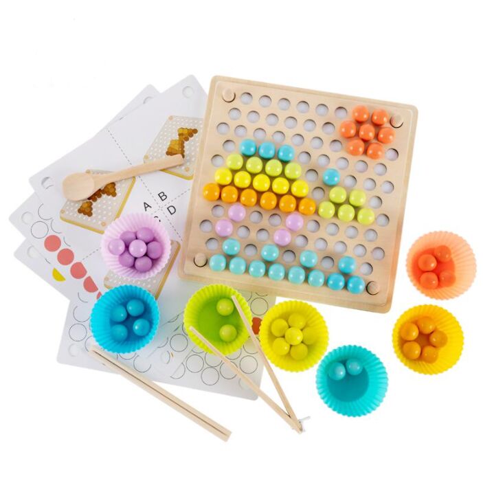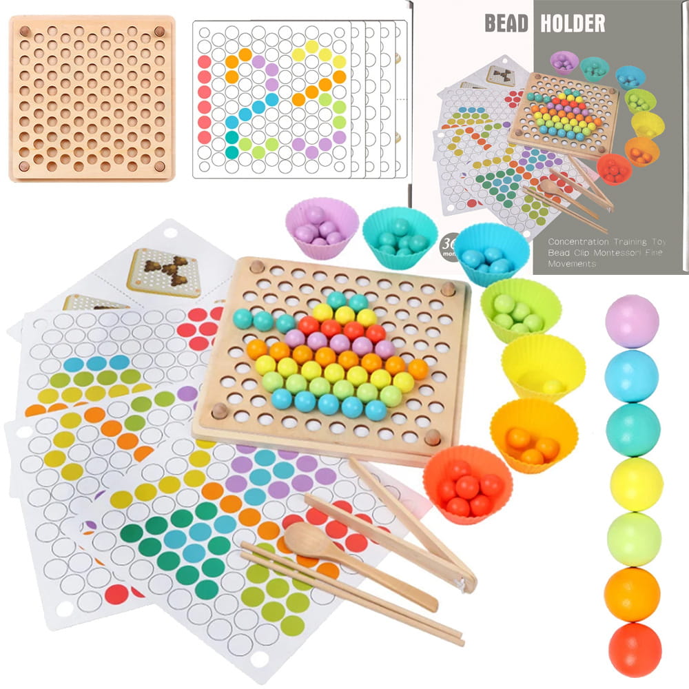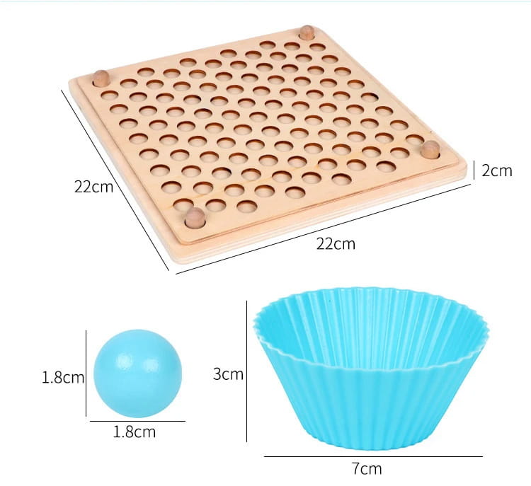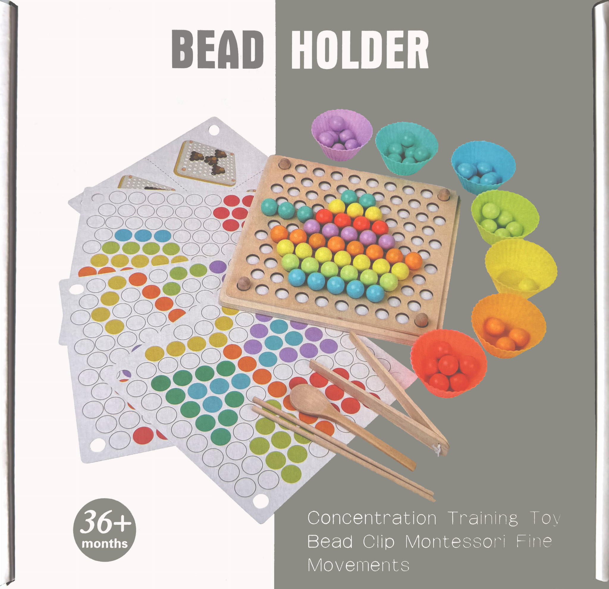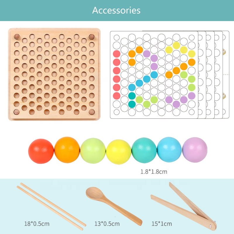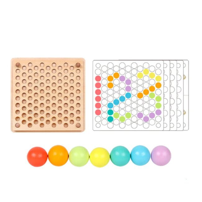 Zestaw składa się z 7 miseczek i 77 kuleczek (po 11 z każdego koloru). Występują one w pastelowych odcieniach: czerwonym, pomarańczowym, żółtym, zielonym, turkusowym, niebieskim i fioletowym. Zabawa polega na układaniu kolorowych drewnianych kulek zgodnie z rysunkiem umieszczonym pod drewnianą platformą. Do dyspozycji dziecko będzie miało drewniane szczypce, łyżkę oraz pałeczki. Przed rozpoczęciem zabawy dziecko może posegregować kulki zgodnie z ich kolorem do pasujących kolorystycznie foremek.