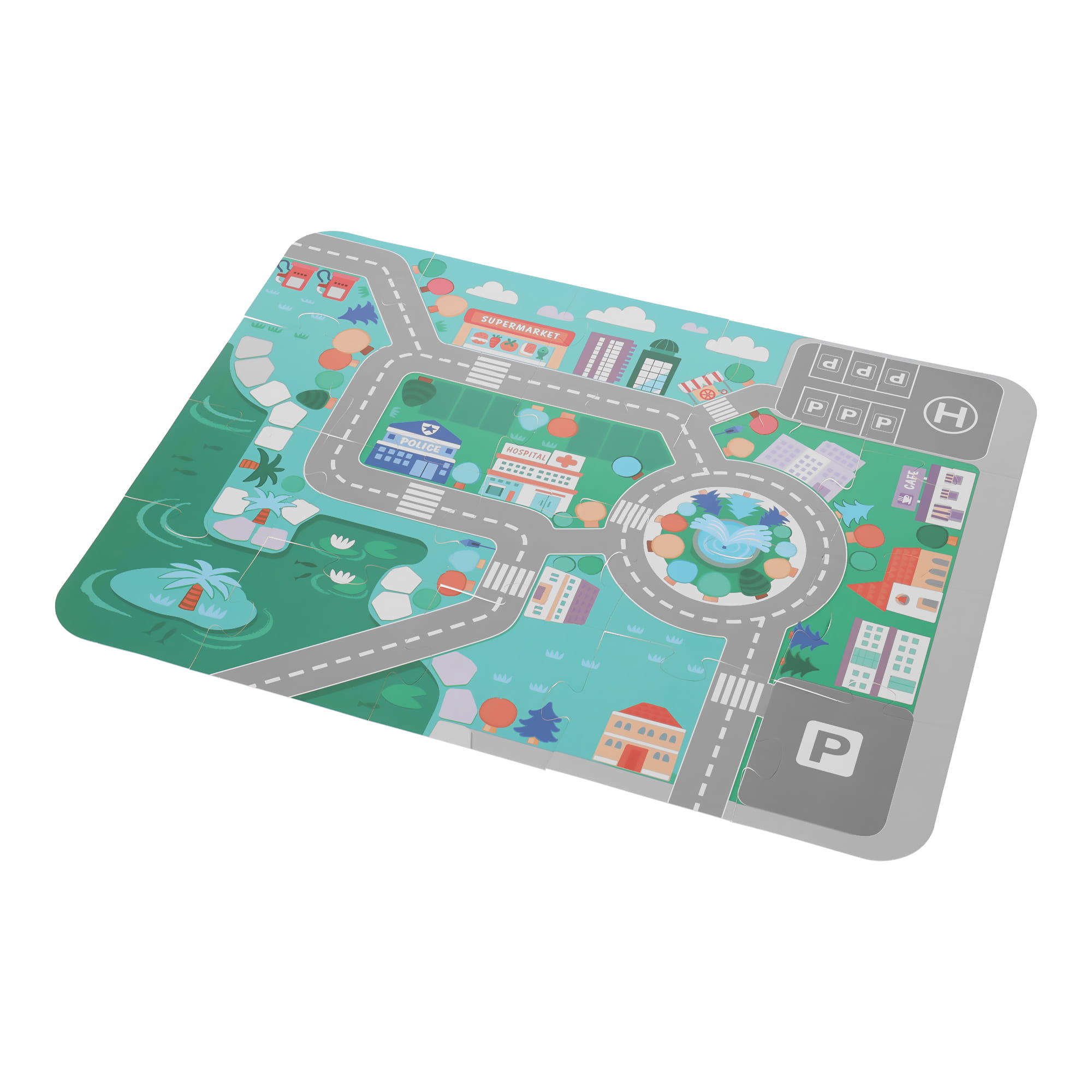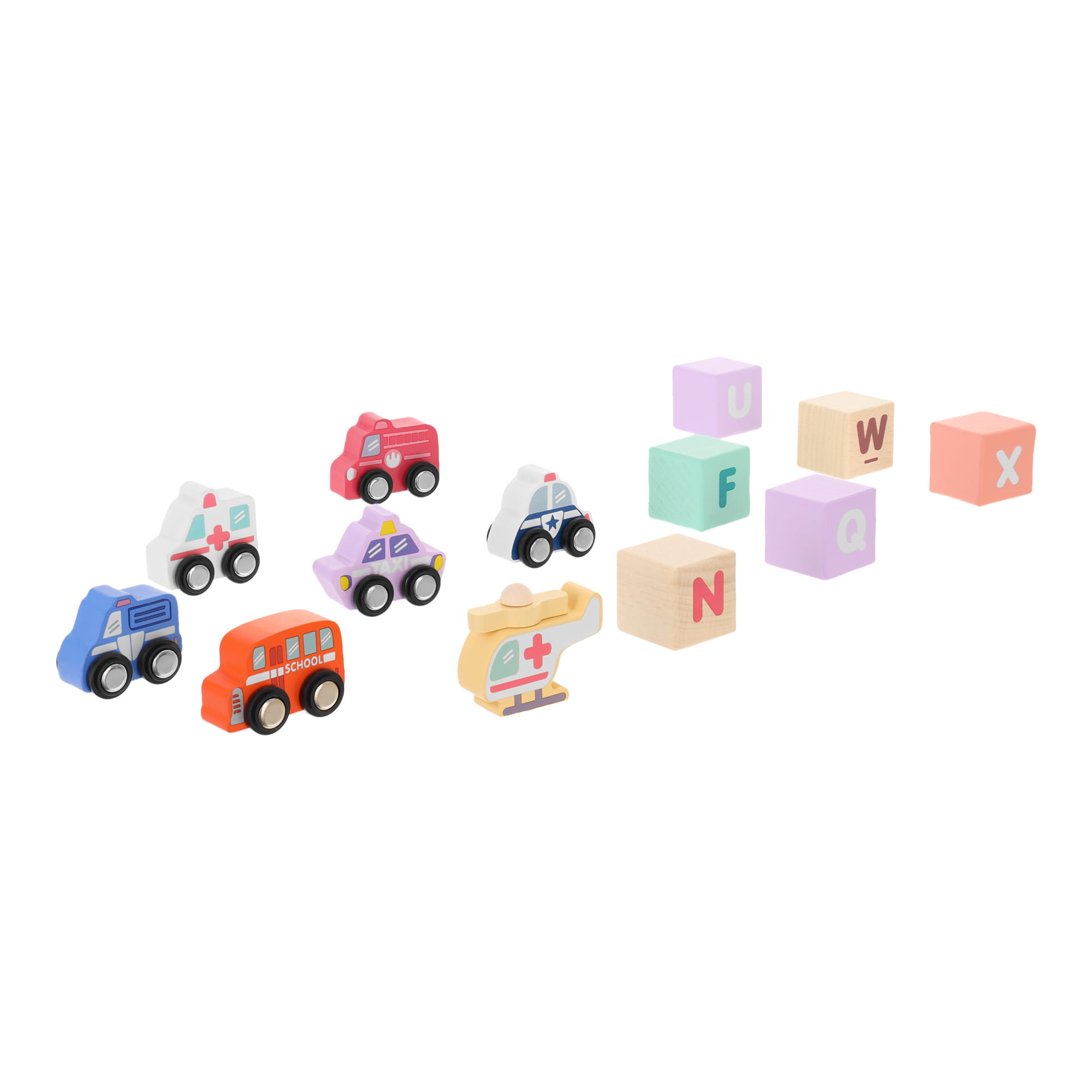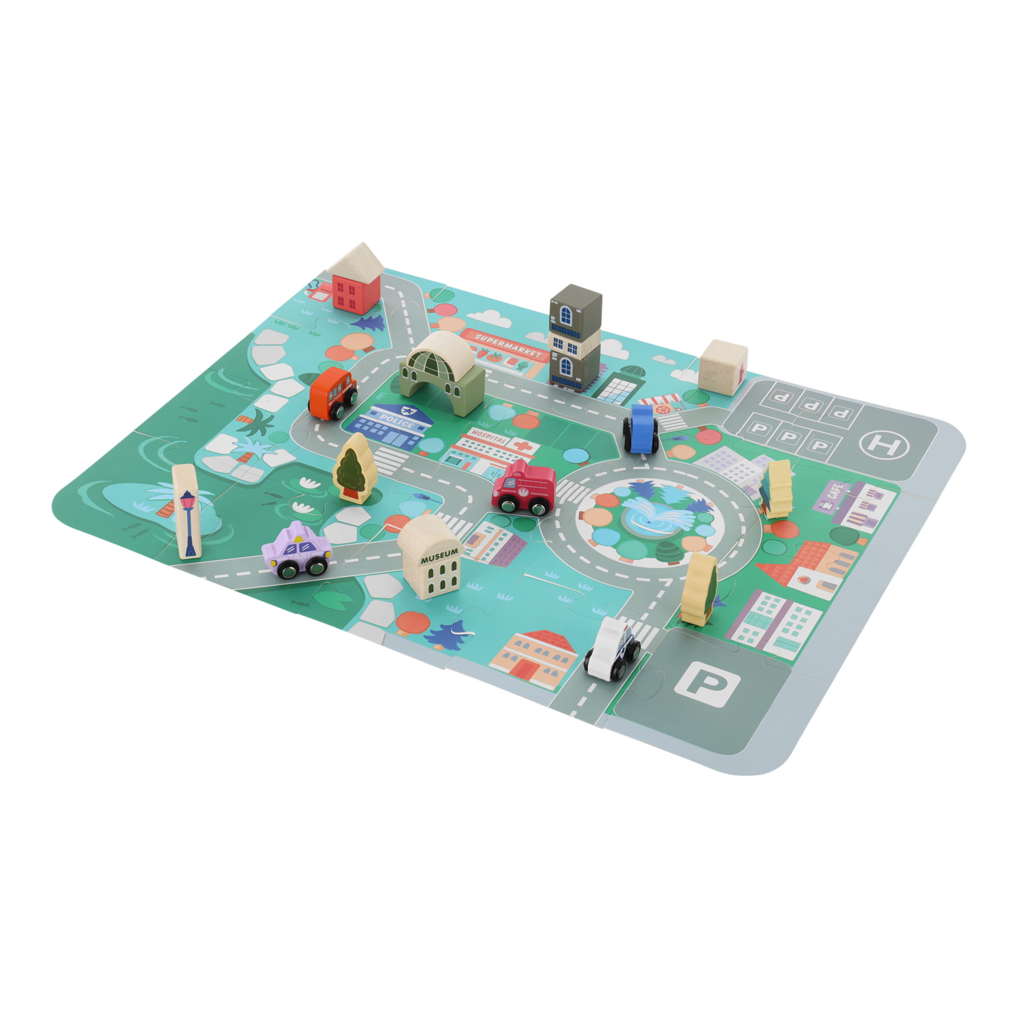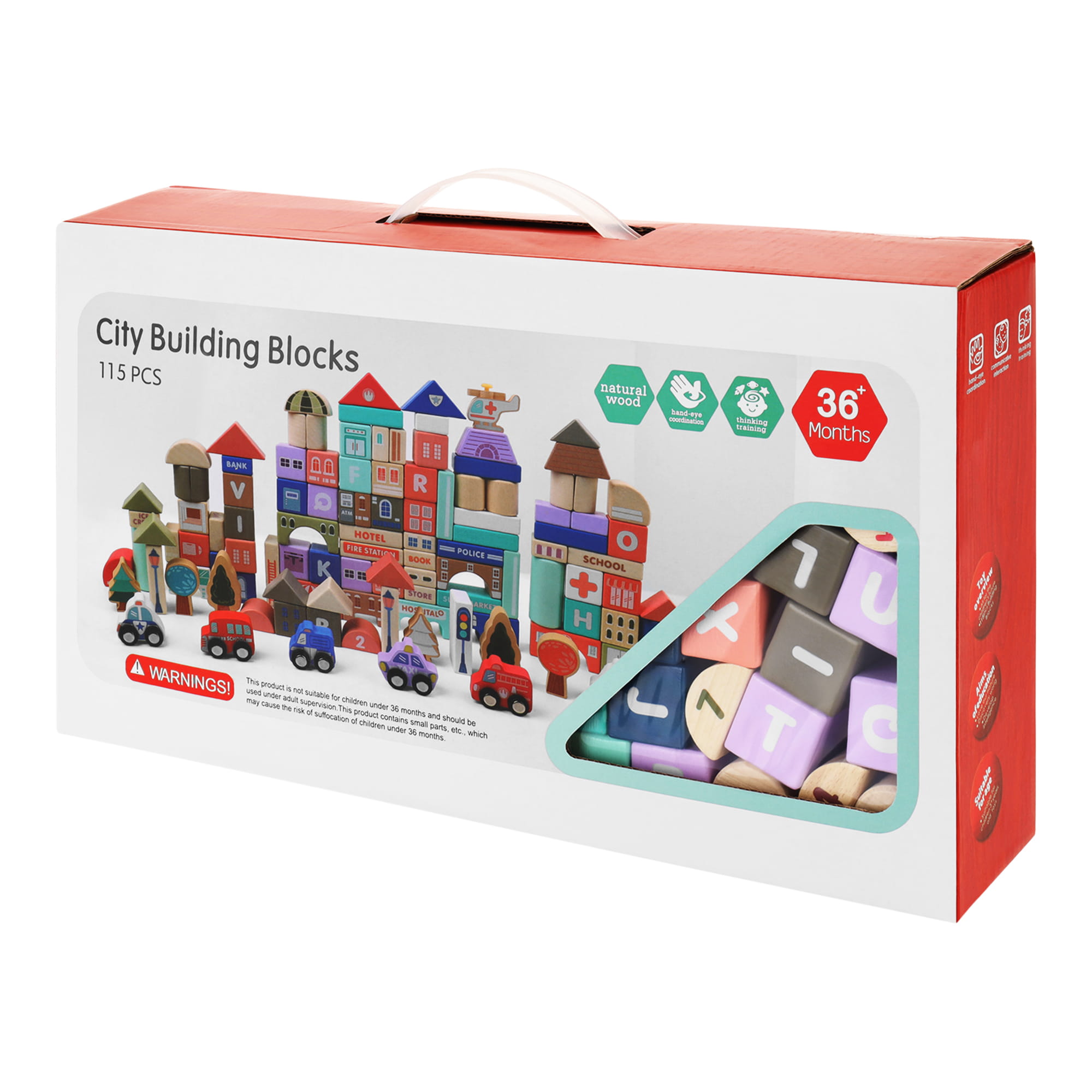Zestaw drewnianych klocków to doskonały prezent dla każdego dziecka niezależnie od jego wieku czy płci. Z jego pomocą zbudujecie własne miasto. Ogranicza Was jedynie wyobraźnia. W skład zestawu wchodzą samochodziki, znaki, drzewka oraz budynki. Na klockach znajdują się także cyferki i literki, które pozwolą połączyć zabawę i naukę.