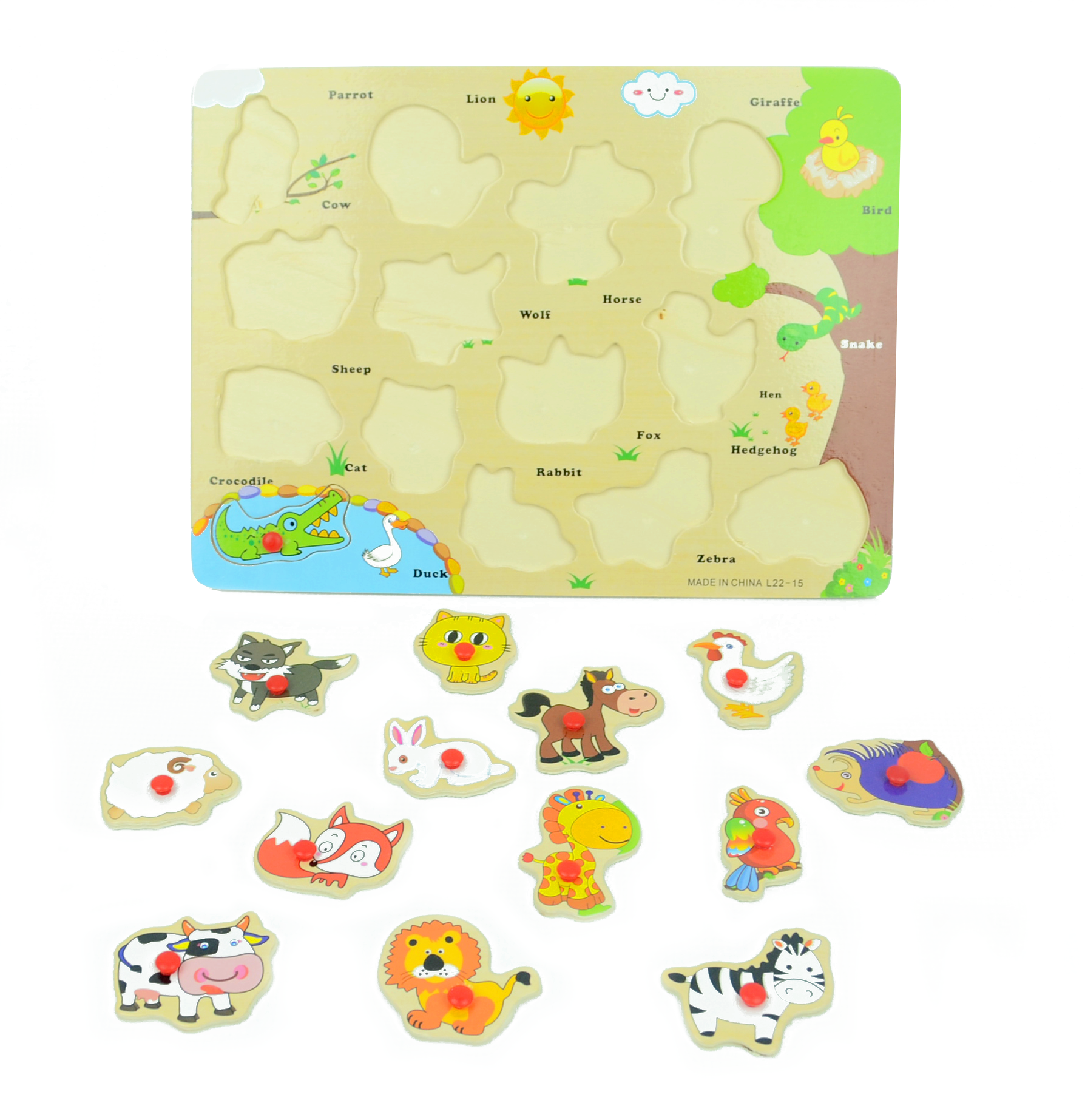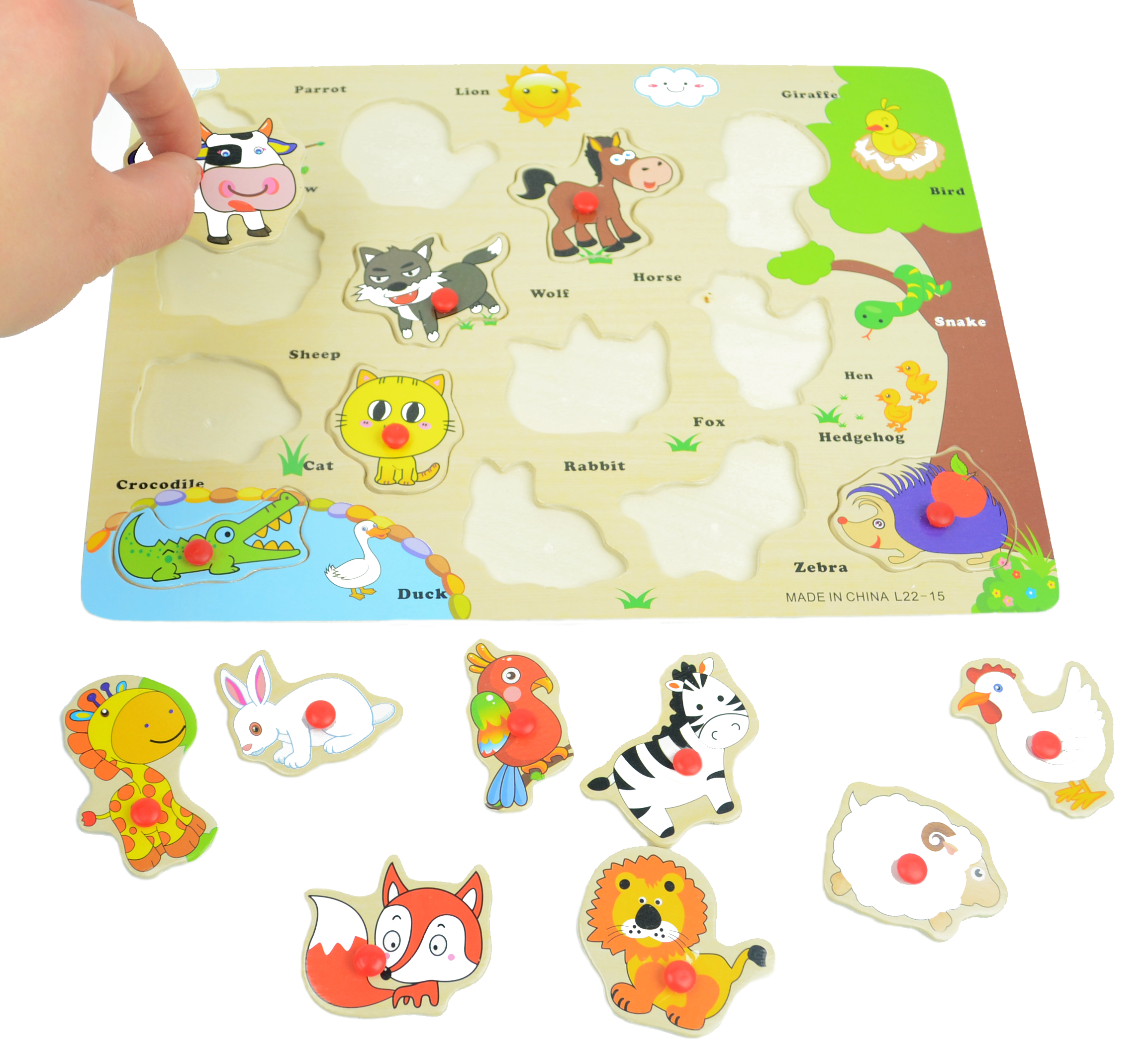 Układanka skupia w sobie wizerunki różnych zwierząt. 14 z nich umieszczonych jest na ruchomych puzzlach opatrzonych wygodnymi uchwytami. Dzięki nim, dziecko bez problemu chwyci i podniesie wybrany element. Każdy detal posiada adekwatne do rysunku krawędzie, więc dopasowuje się tylko we właściwe miejsce. Zabawa w dopasowywanie kształtów zwierzątek rozwija w dzieciach koordynację wzrokowo-ruchową.