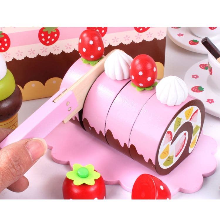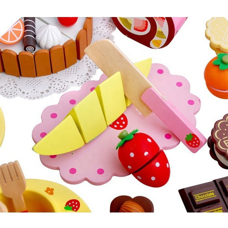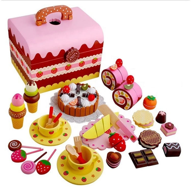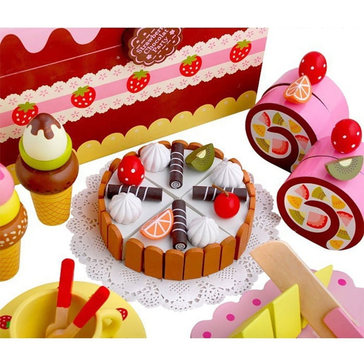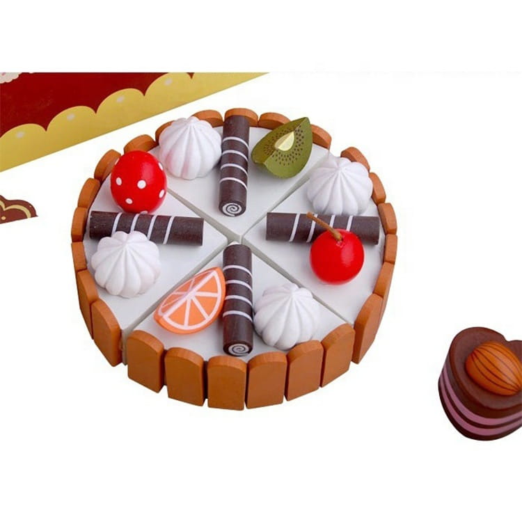 Dzięki swojemu wyjątkowemu designowi jest idealnym pomysłem na prezent. Drewniane słodycze z zestawu posiadają rzepy lub magnesy, dzięki którym za pomocą drewnianego, bezpiecznego „noża” dzieci mogą przekroić ciasto lub torcik.