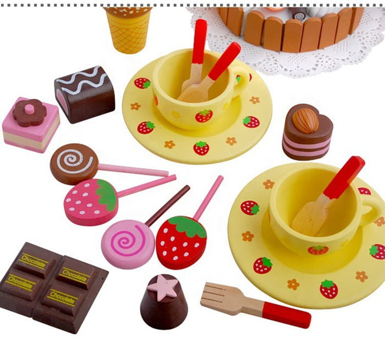Akcesoria zostały wykonane z drewna z dbałością o szczegóły. Zestaw zawiera zastawę, oraz pysznie wyglądające słodycze np. torcik, lody, czekoladki, lizaki czy ciasteczka czyli wszystko co jest potrzebne do urządzenia wspaniałego przyjęcia. Z pewnością zapewni dziecku radość i wiele godzin wyśmienitej zabawy.