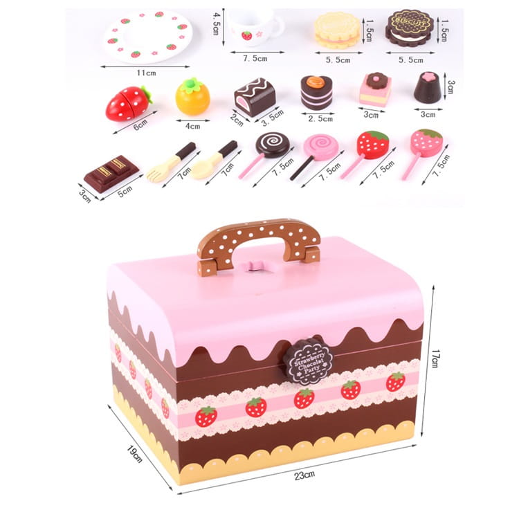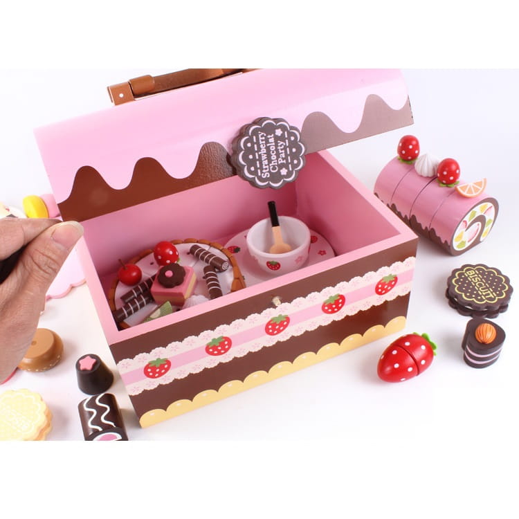 DREWNIANY KUFEREK / KREATYWNY ZESTAW DO ZABAWY / KUFEREK Z ŁAKOCIAMI / SŁODYCZE / CIASTO / 29 ELEMENTÓW