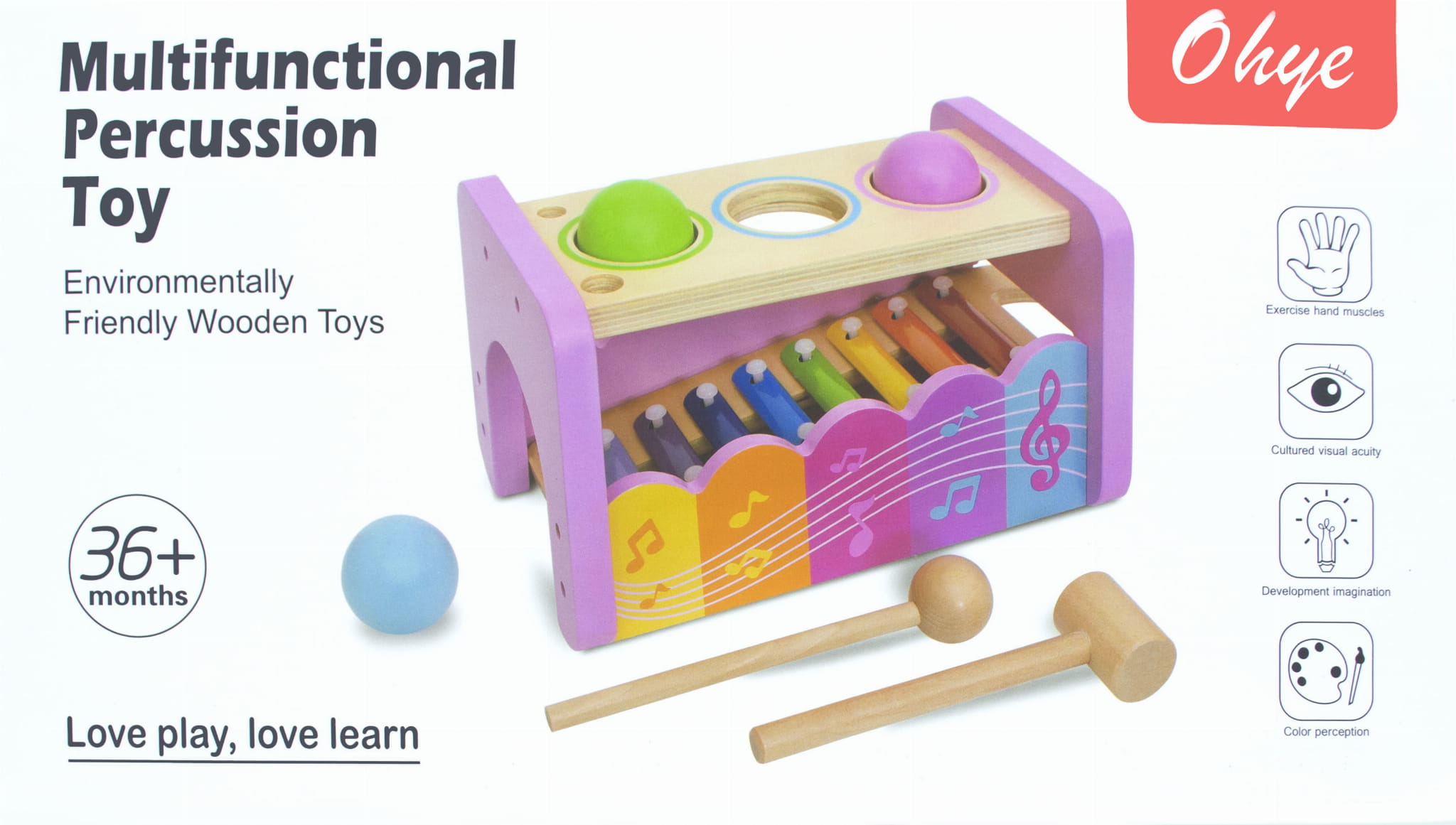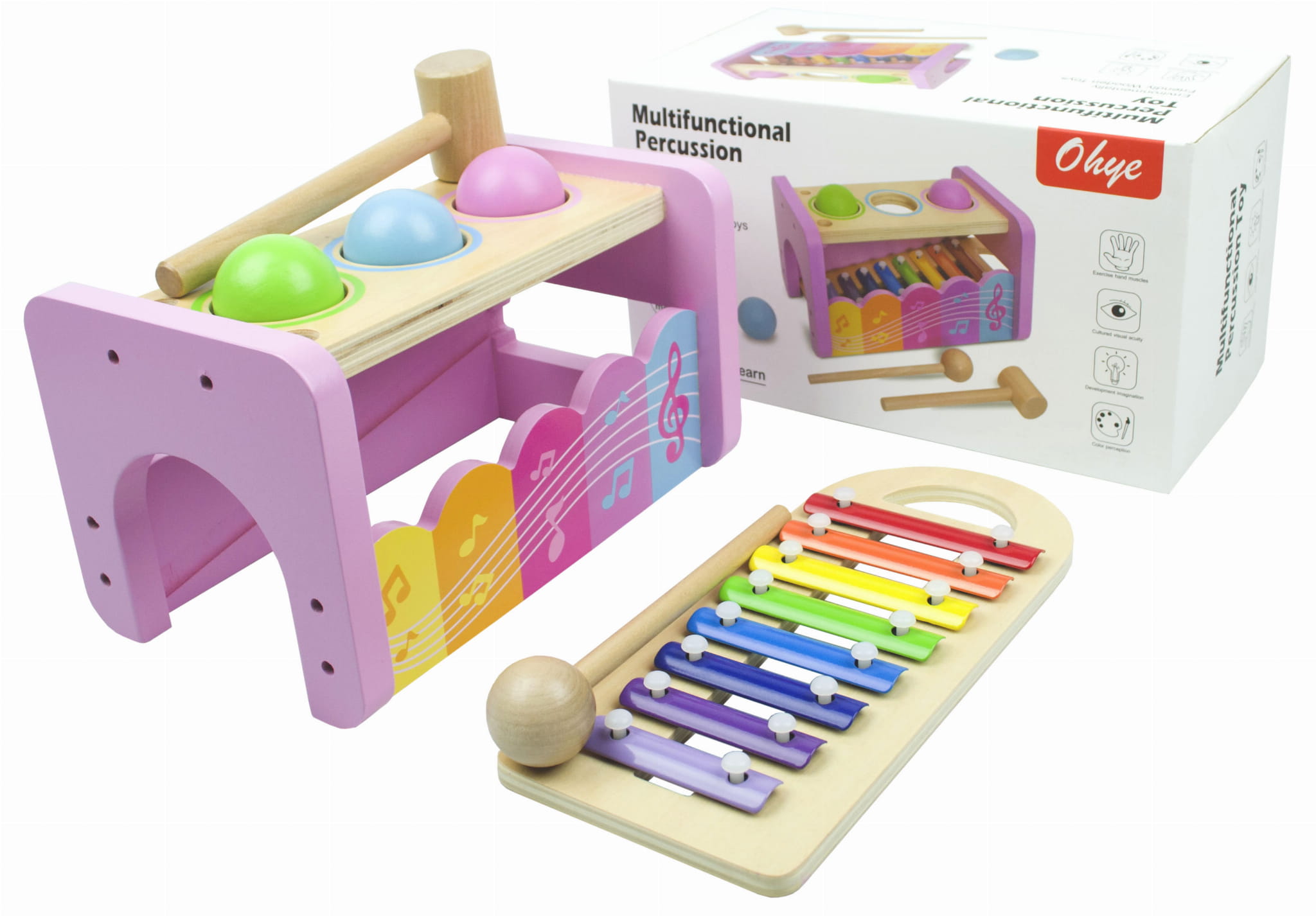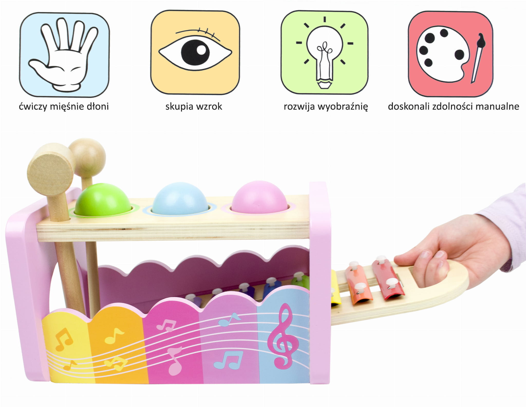 W zestawie znajdują się młoteczek, pałeczka i trzy kule. Akcesoria również są wykonane z drewna, posiadają łagodne krawędzie i estetyczne wykończenie. Dziecko bez problemu chwyci je w dłonie.