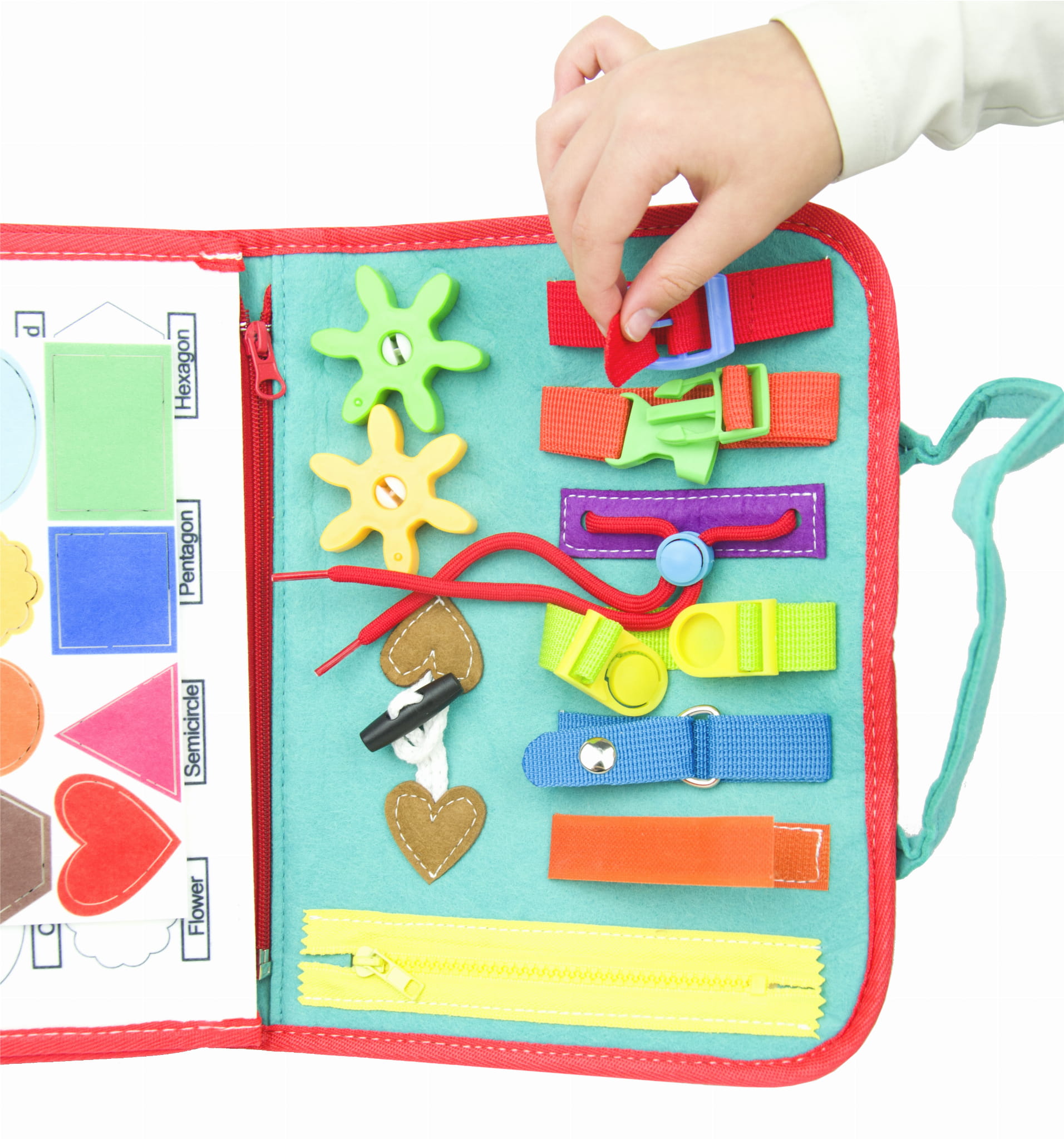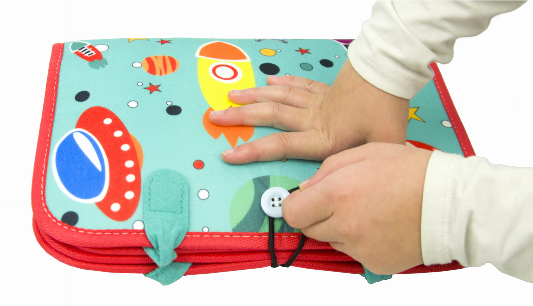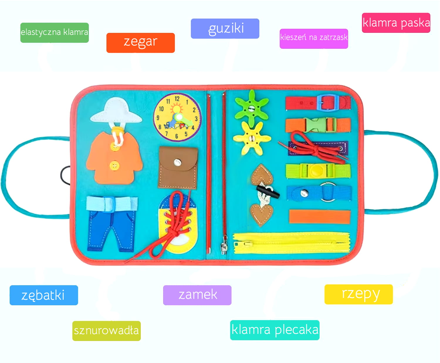 - książeczkę sensoryczną z wygodnymi uchwytami, zapinaną na guzik