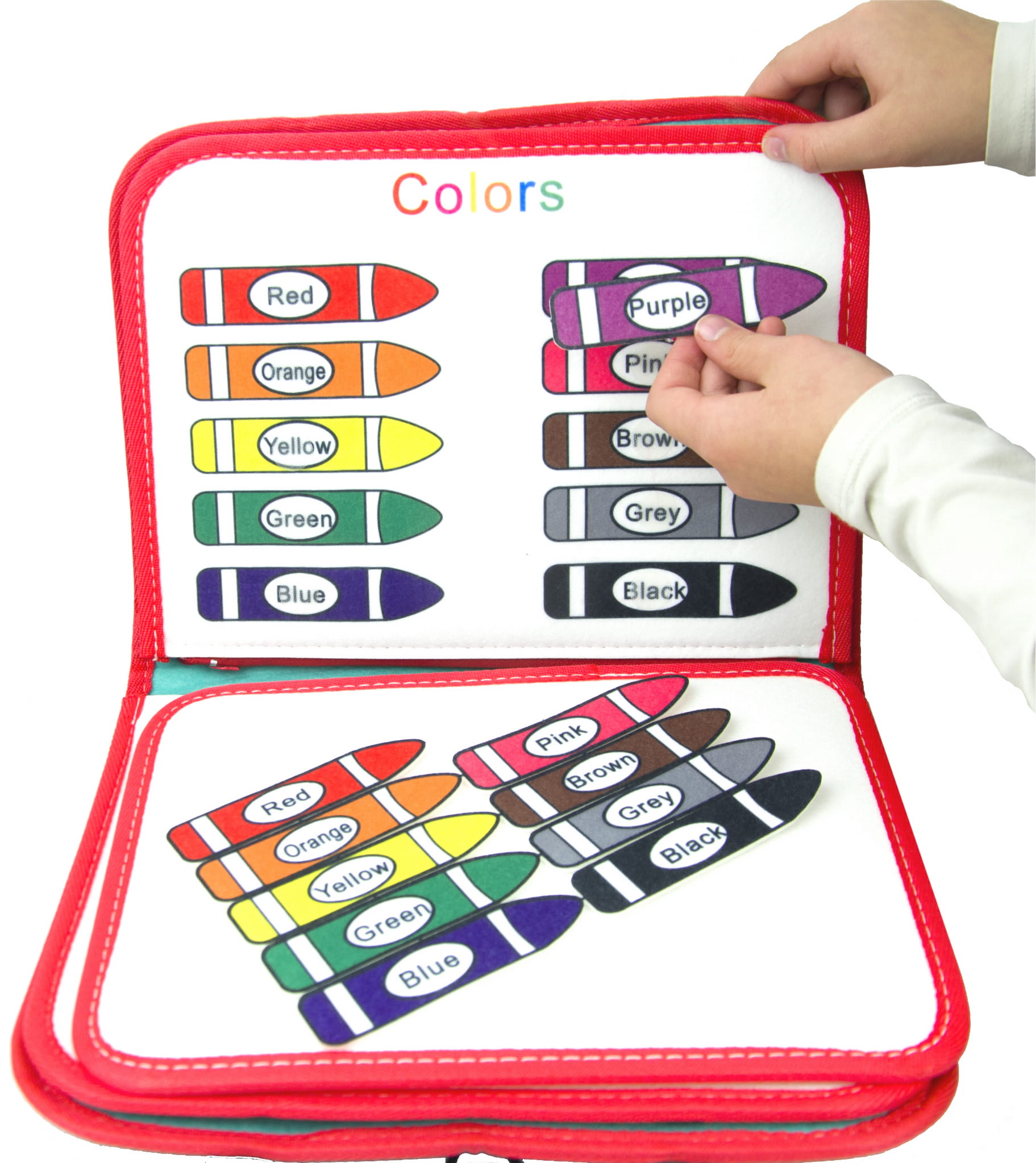 Pozwól dziecku na długą i odkrywczą zabawę! Nasza książeczka została wyposażona w mnóstwo zdejmowanych warstw wspierających naukę w idei Montessori. Dziecko rozwija się poprzez dotyk i wrażenia sensoryczne. Od teraz może nauczyć się kolorów, kształtów, działania zegara a także tego, jak zapinać guziki, klamry czy nawet zawiązać but! Wszystko to zamknięte w wygodnej walizce. Wystarczy odpiąć guzik i można przystąpić do eksplorowania zawartości.