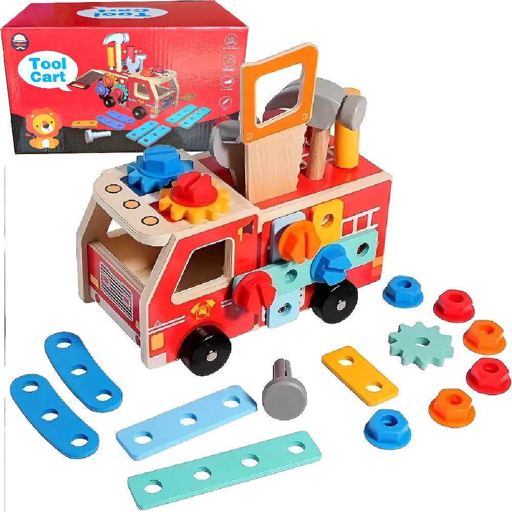 LT630 DREWNIANY WÓZ STRAŻACKI WALIZKA Z NARZĘDZIAMI DLA DZIECI