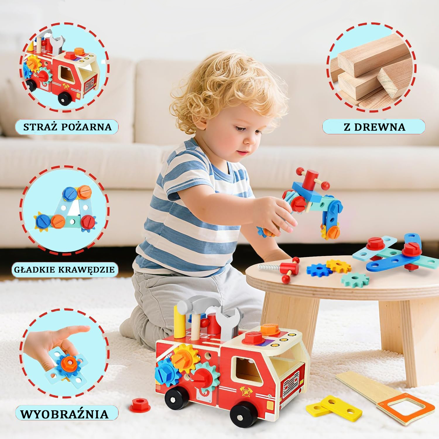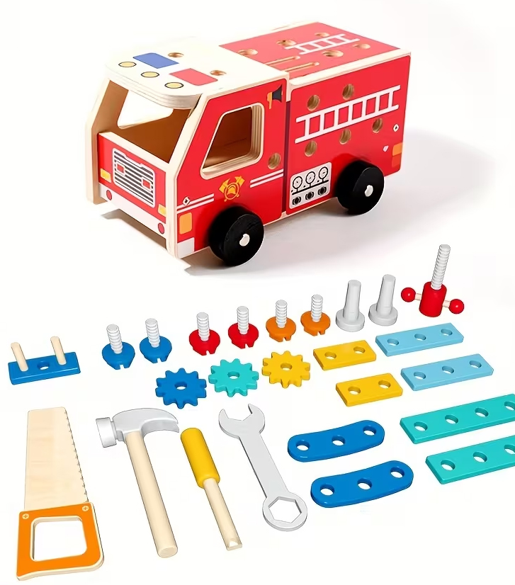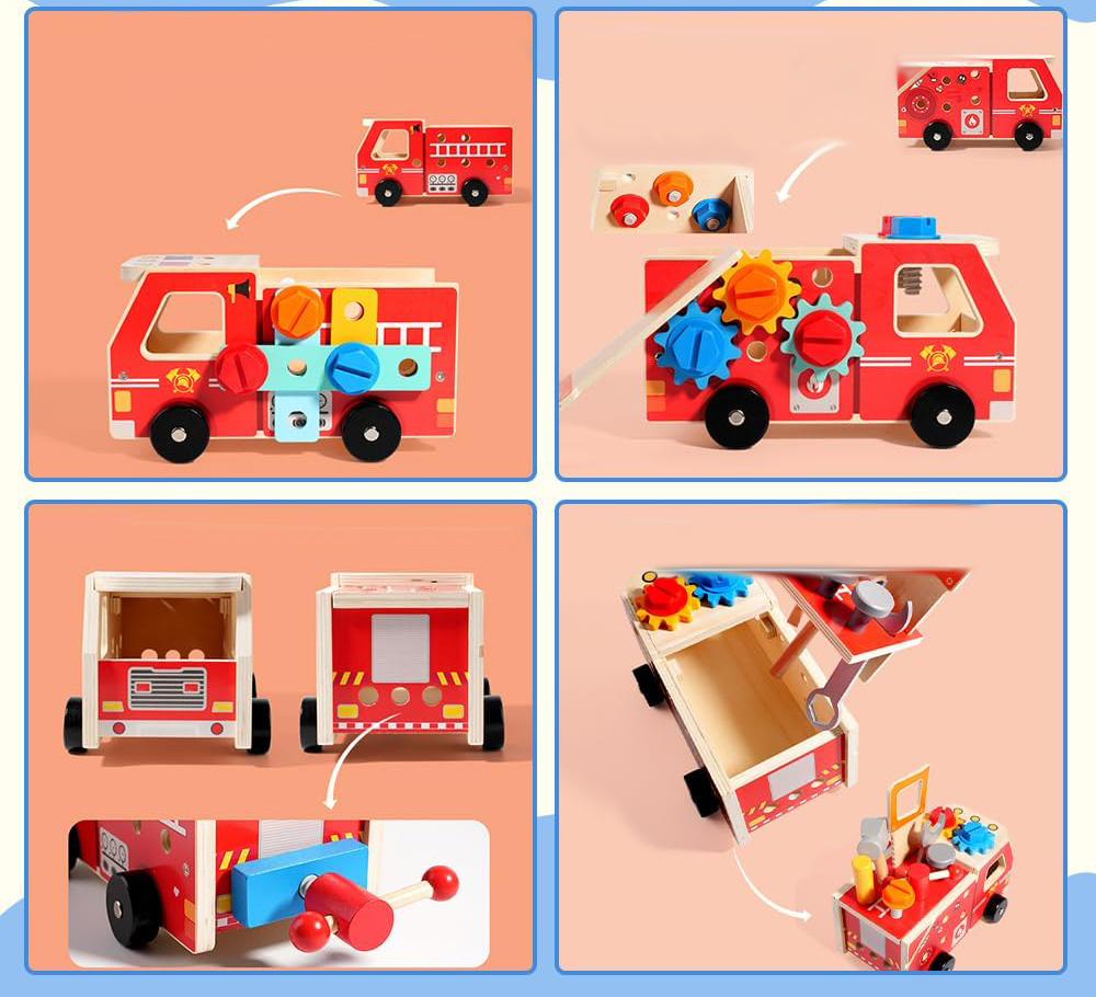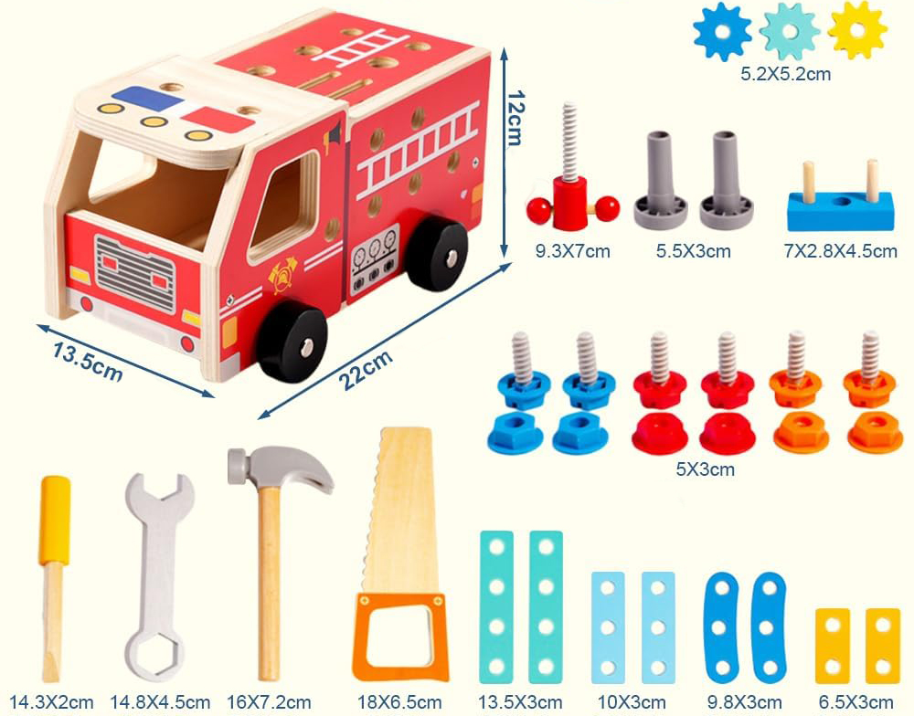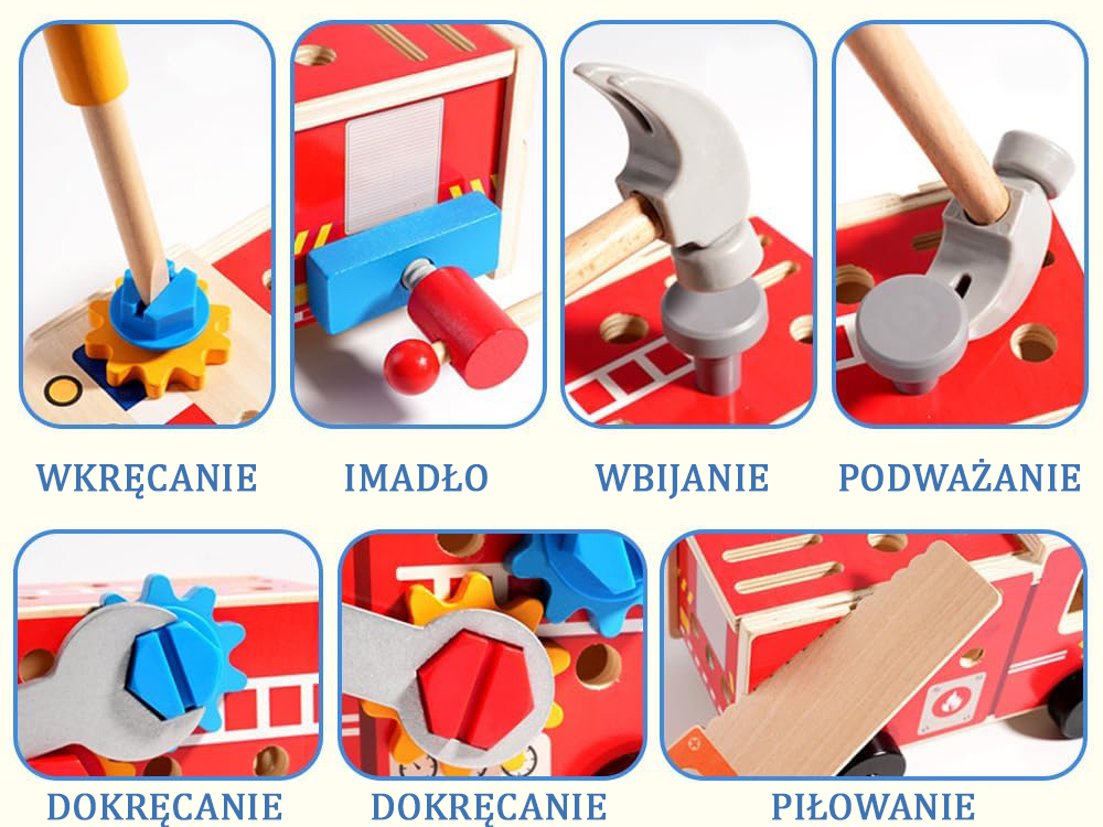 Drewniana straż pożarna to fantastyczny zestaw dla każdego małego majsterkowicza. Teraz dzieci będą mogły pomagać rodzicom w codziennych pracach naprawczych czy przy majsterkowaniu. Podczas naśladowania naprawczych czynności dzieci poczują się jak dorosły.