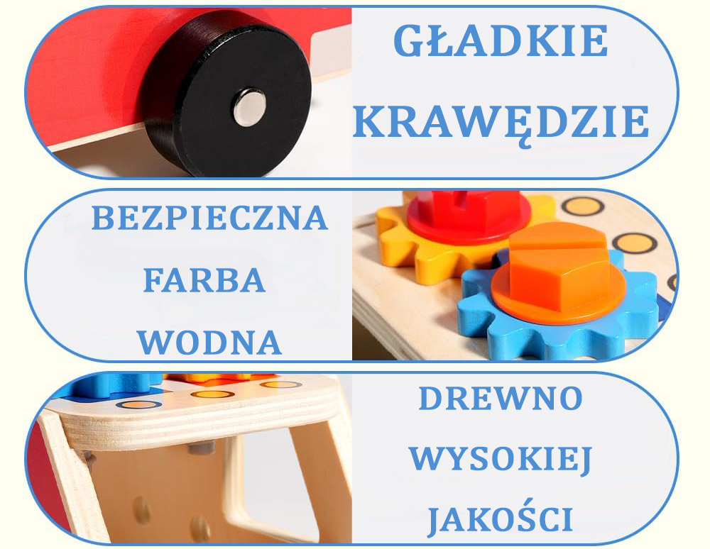 Zestaw posiada certyfikaty CE i EN 71. Zabawka jest przyjazna środowisku, nieszkodliwa dla zdrowia. Wykonana z drewna, wspiera ekologię i jest świetną opcją wobec plastikowych odpowiedników. Elementy pokryte zostały nieszkodliwą farbą wodną. Zestaw jest starannie wykończony, elementy łatwo dopasowują się w odpowiednie miejsca.