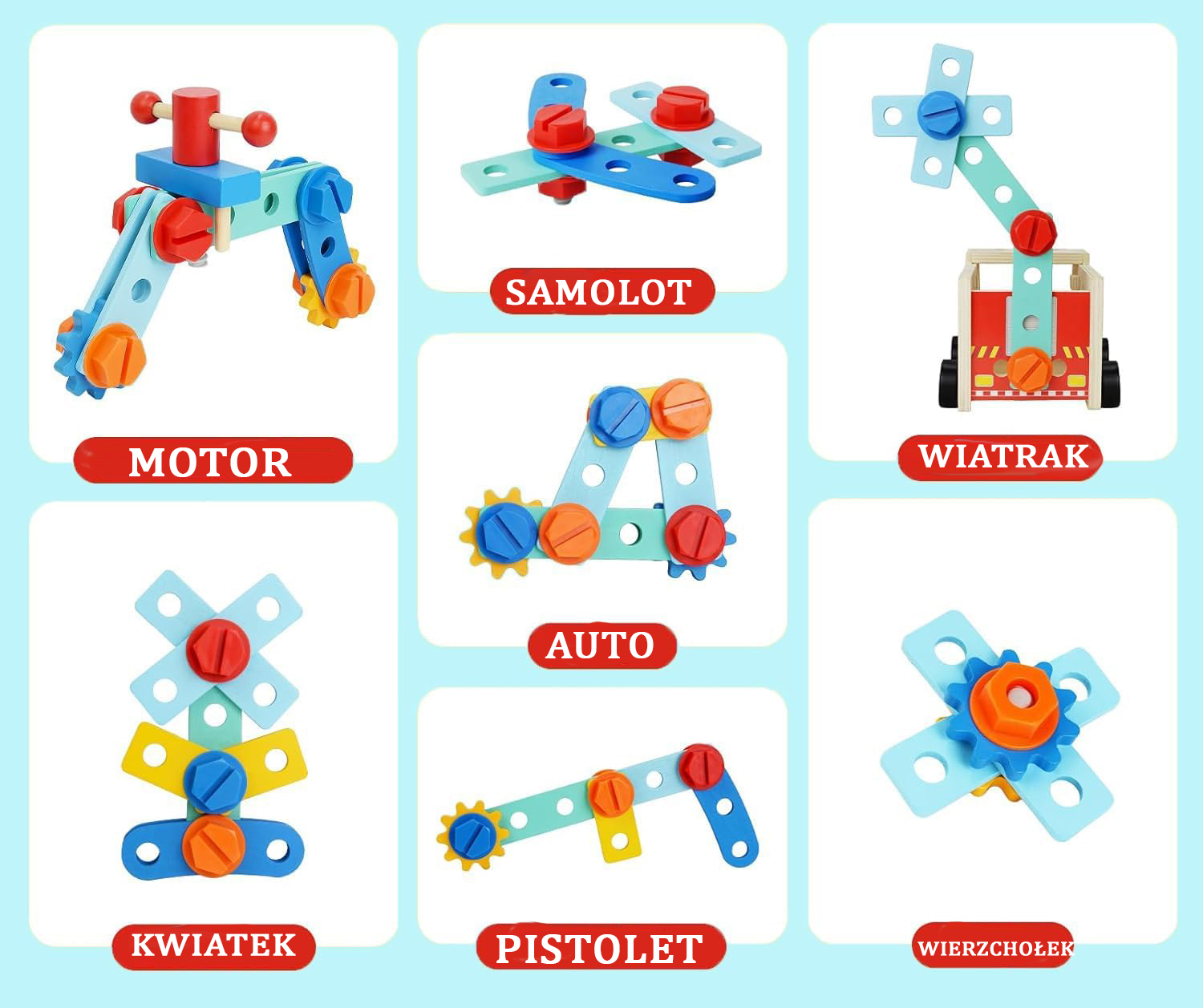 - materiał: drewno, karton, plastik