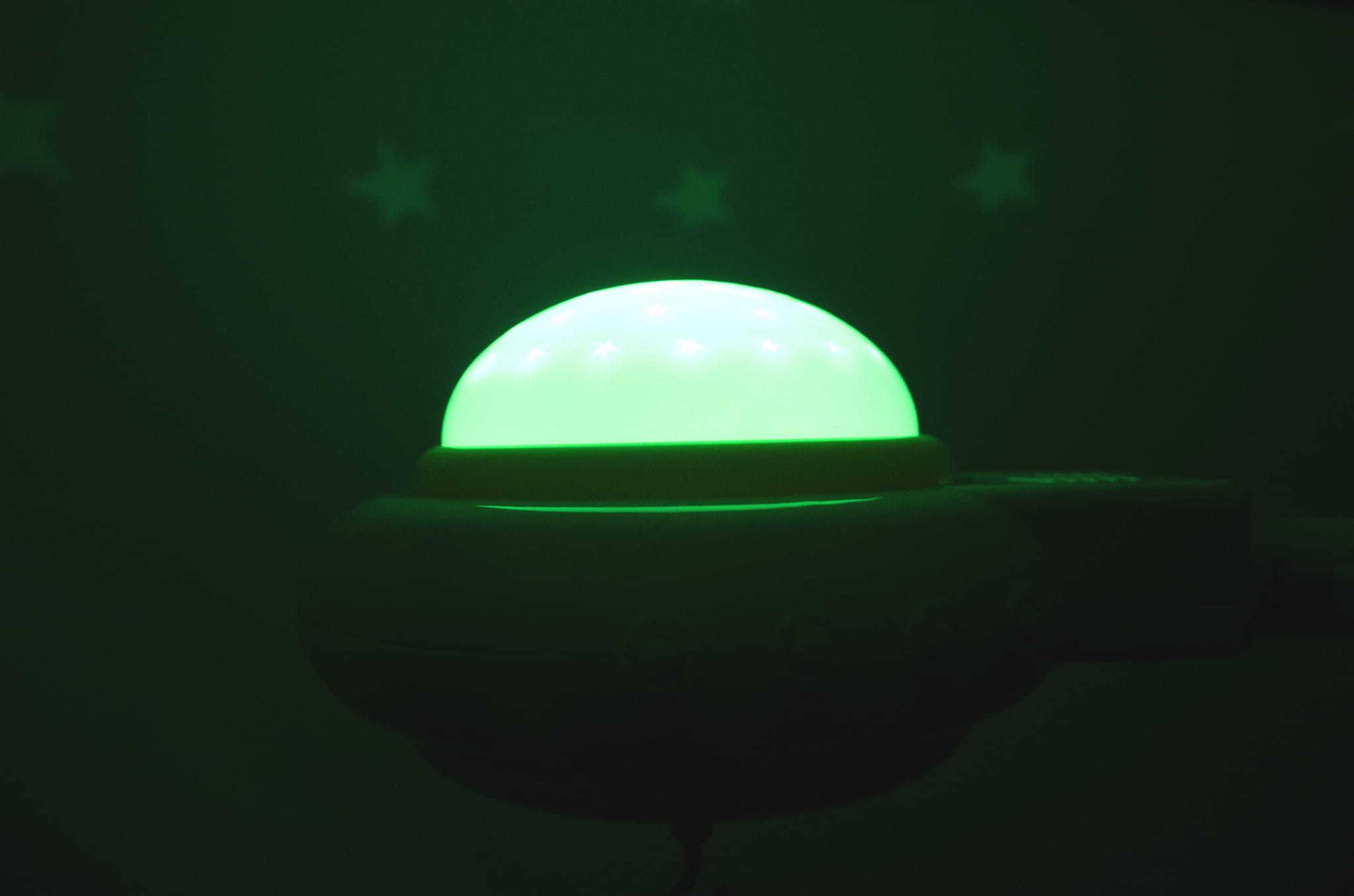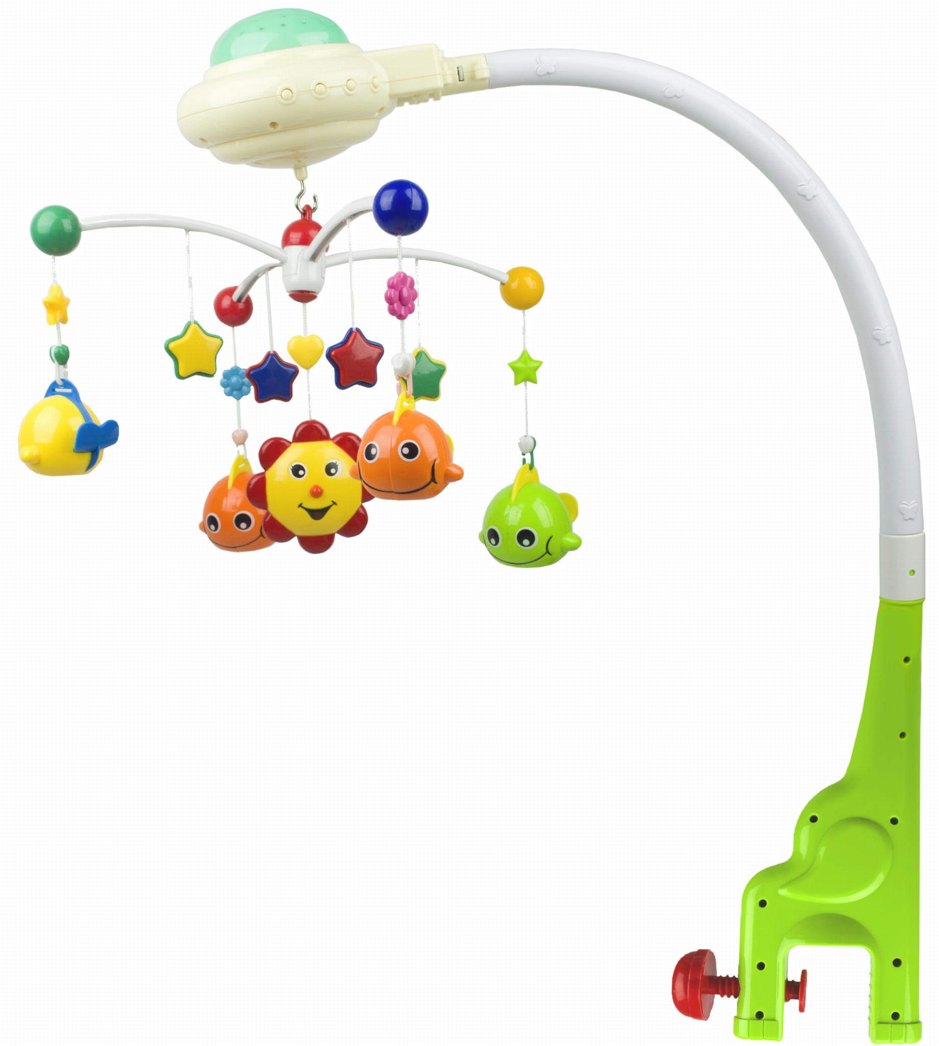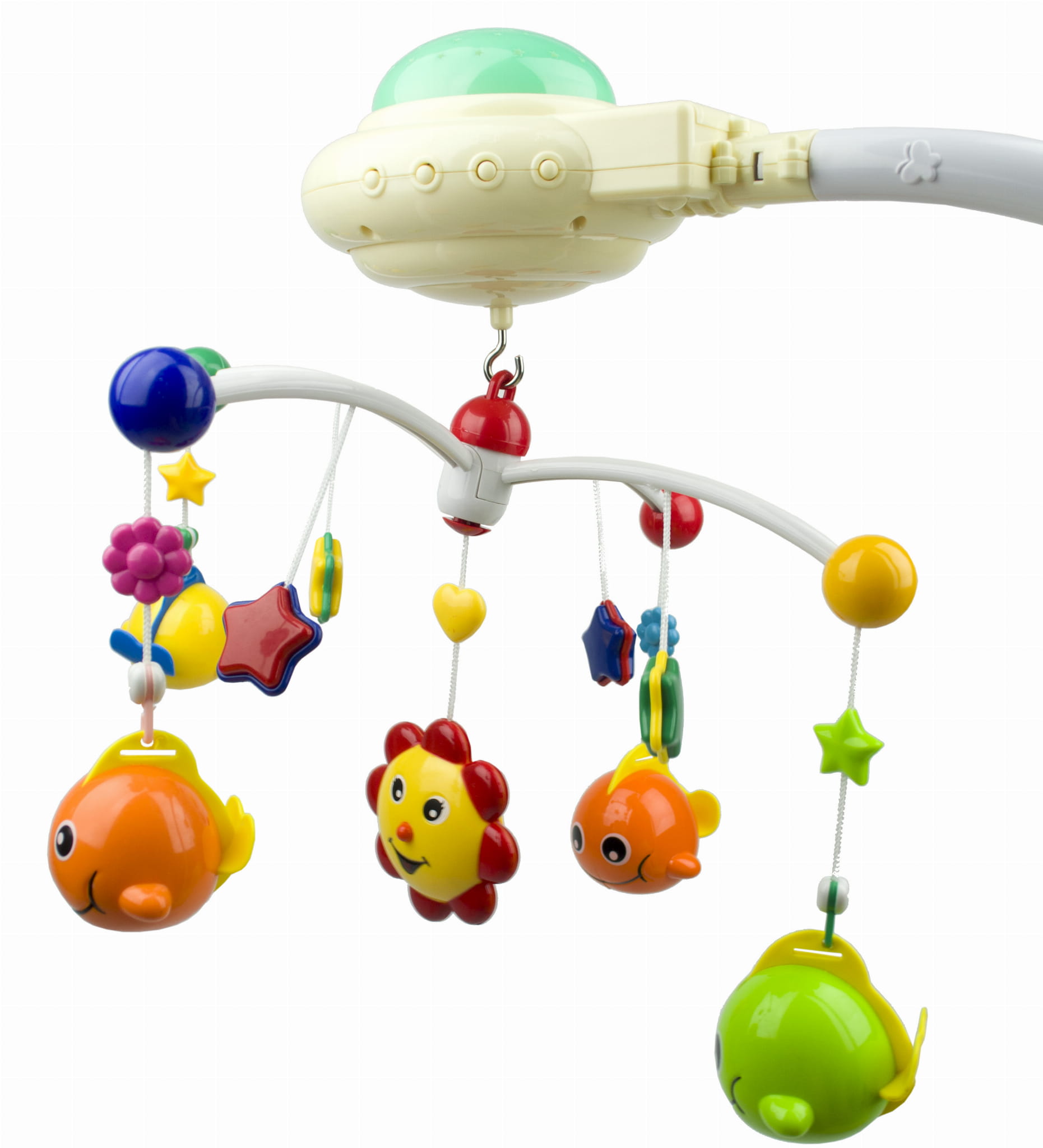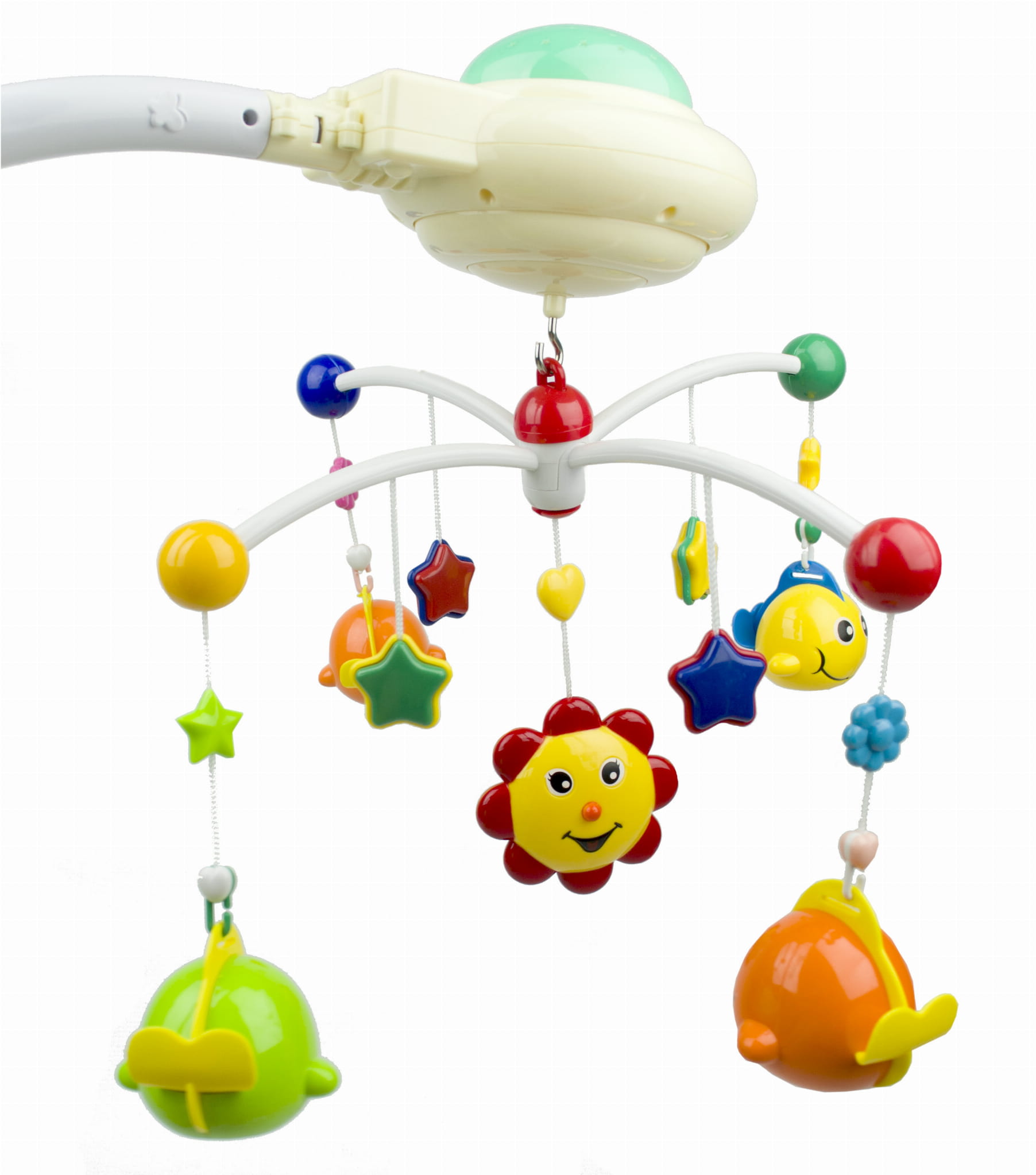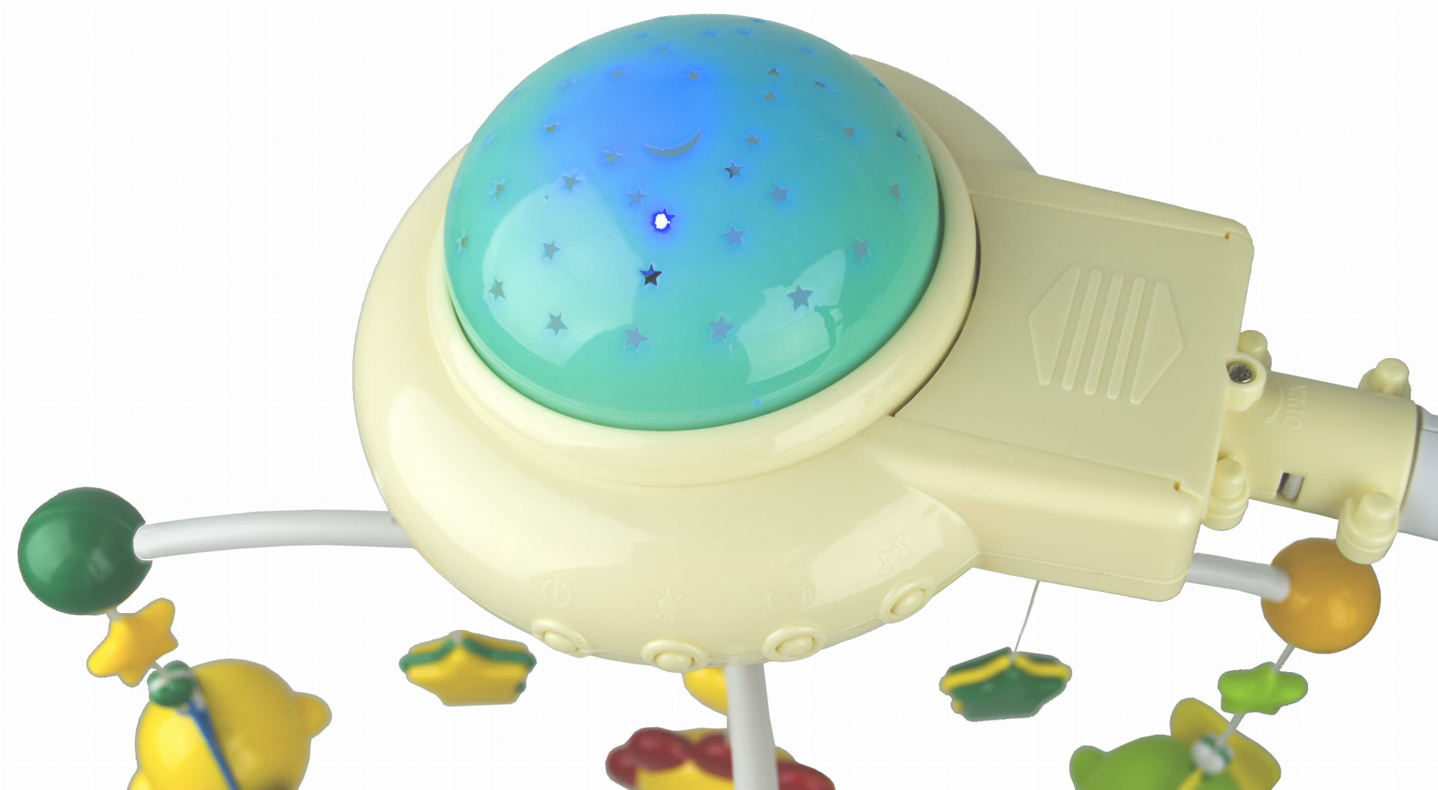 Łagodny gwiezdny pokaz światełek i delikatnie poruszające się rybki nad głową malucha przyciągają jego wzrok i stymulują rozwijające się zmysły. Atutem karuzeli jest fakt, że nie trzeba jej nakręcać. Posiada 4 przyciski do uruchamiania osobnych działań:
