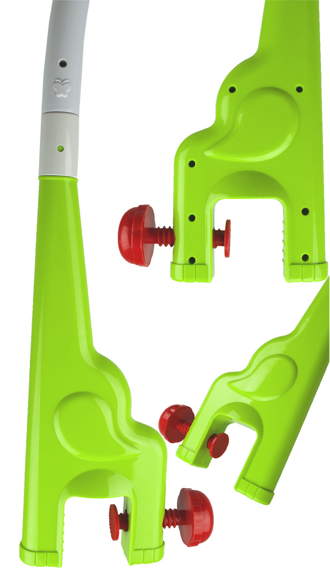 Pałąk posiada mocowanie typu „imadło”, więc jest regulowany odpowiednio do grubości ramy łóżeczka. Możliwe jest zamocowanie zabawki nie tylko do łóżeczka, ale także do wózka, dlatego bez problemu będzie towarzyszyć maluchowi na spacerze.